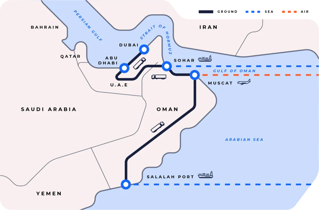 The same customs transit structure applies to air cargo arriving in Oman, allowing seamless onward movement into the UAE via bonded trucking.
